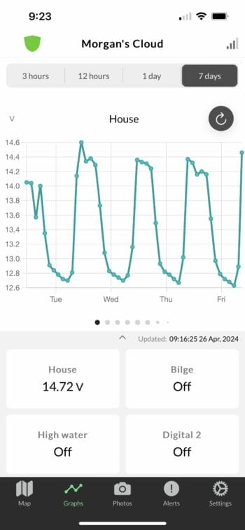 The above is a graph of battery voltage on our J/109, currently still out of the water but uncovered.