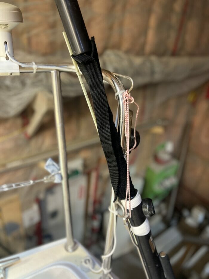 One caution, I would not use this hack for anything heavily loaded like a halyard, since the knot will reduce the strength quite a bit—halyards, particularly using high-modulus lines, should always be spliced. But in this case I’m only using Amsteel for its low stretch, not strength—probably have a 50:1 safety margin.