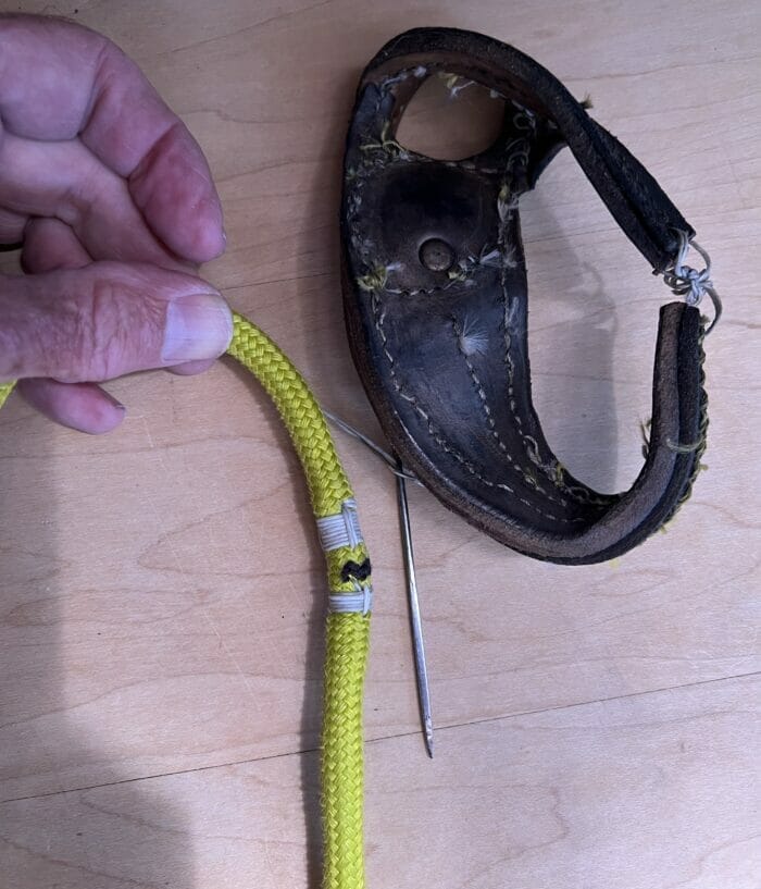 When shortening a line, it’s way easier if we put on two sailmakers whippings and then cut the line between them. Whipping how-to. (Scroll down to #6)