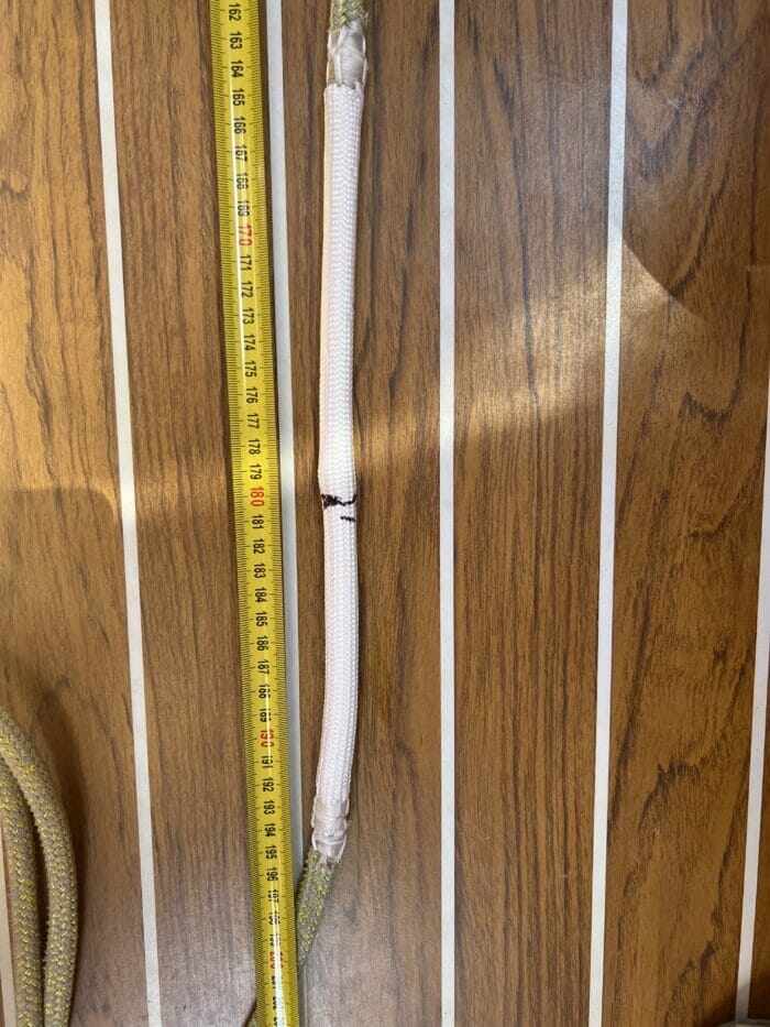 After just three day sails our main halyard is mangled. Turns out @sparcraft jammed the wiring conduit right up under the sheave on our brand new mast so it deflects the halyard and chafes it. Looked like end of season. We were gutted. No way to fix without unstep, but see next tip.