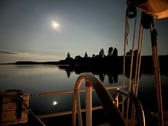 A beautiful full-moon-lit evening in a lovely anchorage rafted up with good friends for a fine dinner.