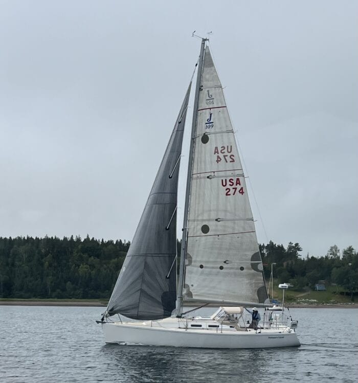 It also works the other way around. Brooke (on the left) owns and seriously races a J/109 on Narraganset Bay. So while she was visiting with our friend Ed, she came out sailing on our J/109 and taught me a huge amount.